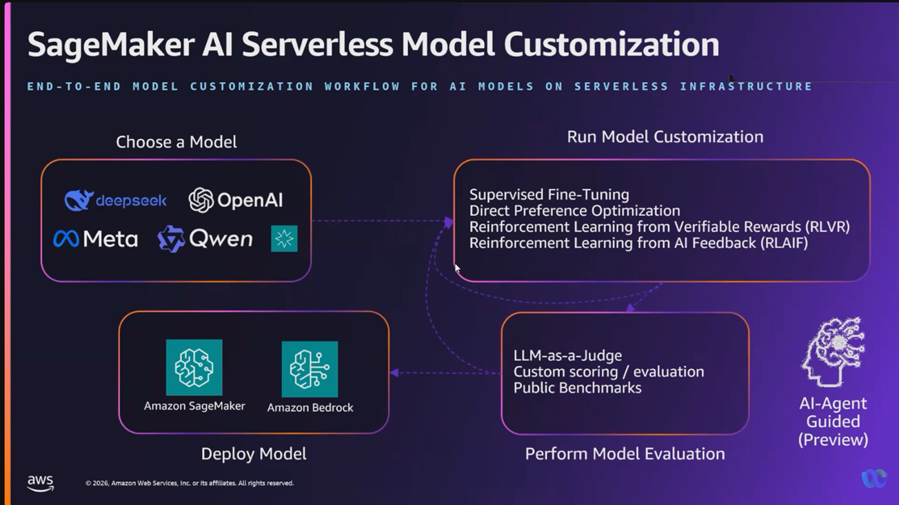 The new Sagemaker AI serverless Model Customization capability provides an easy-to-use interface for the latest fine-tuning techniques like reinforcement learning, so you can accelerate the AI model customization process from months to days.
