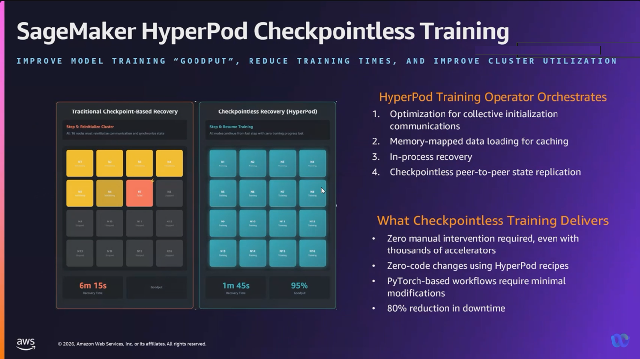With checkpointless training, failed nodes are automatically replaced during runtime, and model state is recovered via peer-to-peer state transfer from healthy accelerators, without relying on external checkpoint restoration. By removing checkpoint dependencies from the recovery path, this approach significantly reduces idle accelerator time, lowers operational costs, and shortens overall training cycles. At scale, Amazon SageMaker HyperPod achieves over 95% training goodput on clusters comprising thousands of AI accelerators.
